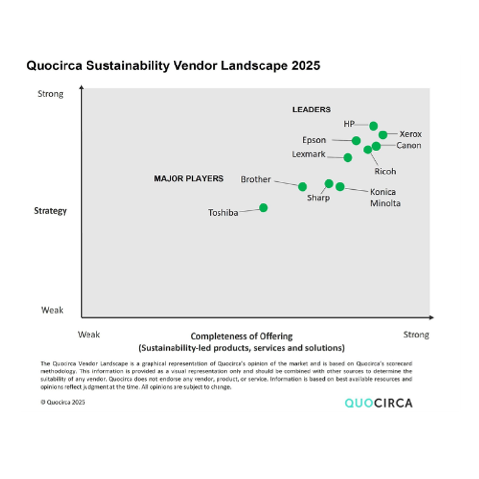 The independent study highlights Ricoh's comprehensive approach to sustainability, combining measurable carbon reduction, circular economy innovation, and data-driven services that help customers achieve their own sustainability goals. Based on Quocirca's scoring methodology, the market research firm positions Ricoh among the office print industry's top performers for the completeness of its sustainability-led offerings and the strength of its sustainability strategy and commitments.