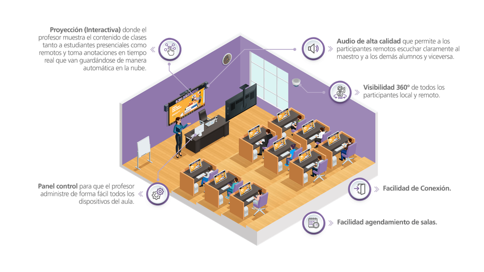 conviertes tus salones de clases presenciales tradicionales en entornos de aprendizaje inmersivo, con herramientas intuitivas para los profesores, simplificando su proceso de enseñanza, y de fácil acceso para los estudiantes, aumentando su colaboración tanto de manera presencial como remota. Incluye capacitación docente.