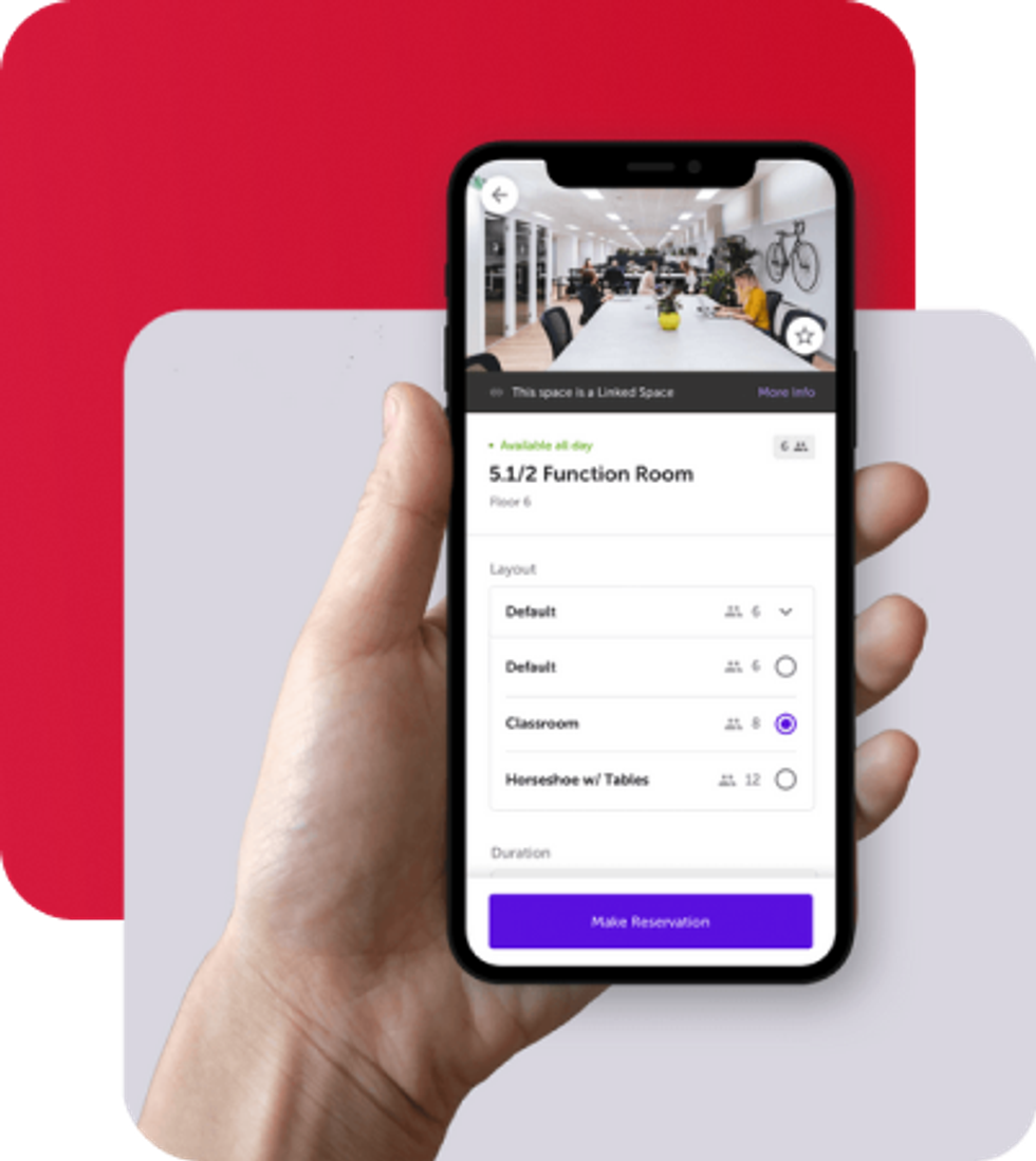 Libera la flexibilidad de tu lugar de trabajo híbrido con la Reserva de espacios: programa escritorios, salas de reuniones, estacionamientos, taquillas e incluso saunas, bajo demanda. Adapta tu espacio de trabajo a cada lugar y a cada colaborador.