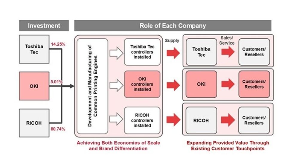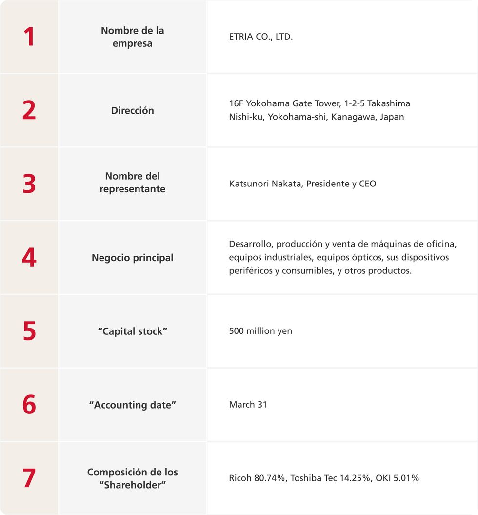 Como resultado de la Integración Empresarial, la proporción de inversión de las tres empresas en ETRIA será: Ricoh 80,74%, Toshiba Tec 14,25%, y OKI 5,01%. El coeficiente de inversión de Toshiba Tec en ETRIA pasará del 15% al 14,25%, y ETRIA dejará de ser una filial de Toshiba Tec.