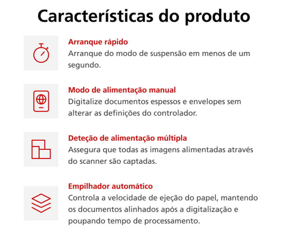 - Conectividade integrada de driver TWAIN e ISIS para compatibilidade com centenas de soluções de software de digitalização
