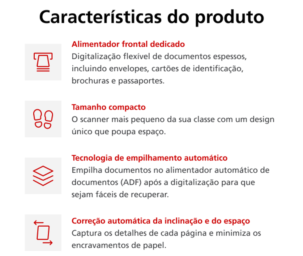 - O alimentador frontal digitaliza documentos de até 5 mm de espessura em 3,5 segundos por página
