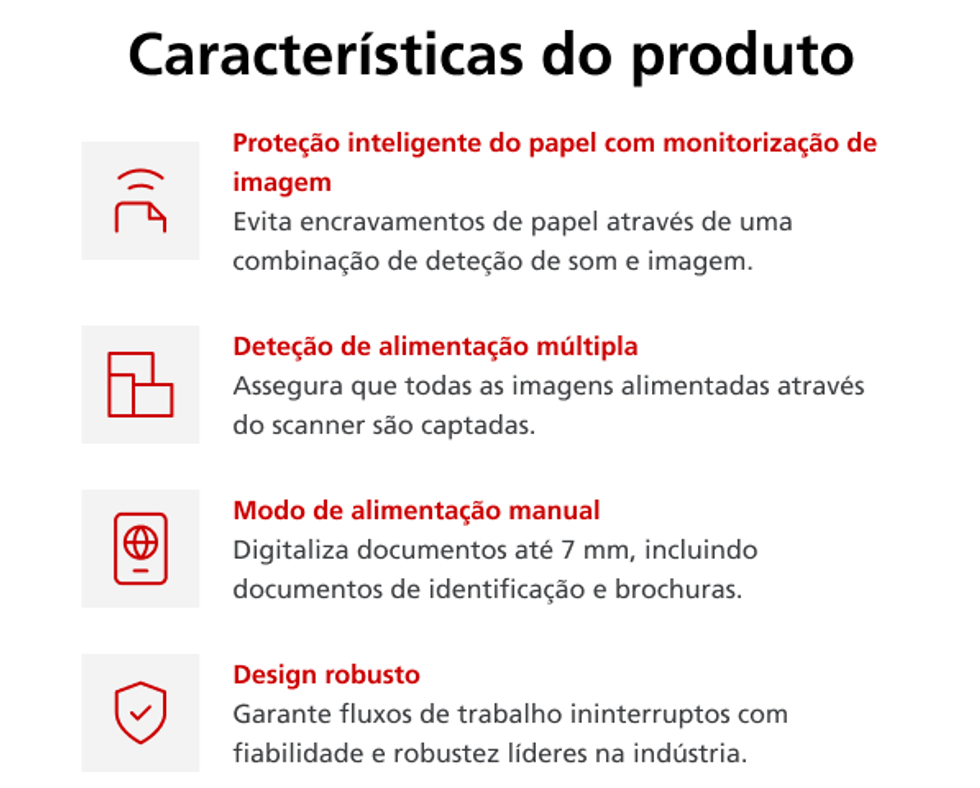 Captura uma grande variedade de documentos de forma consistente, simplificando lotes mistos de documentos e minimizando a necessidade de novas digitalizações.