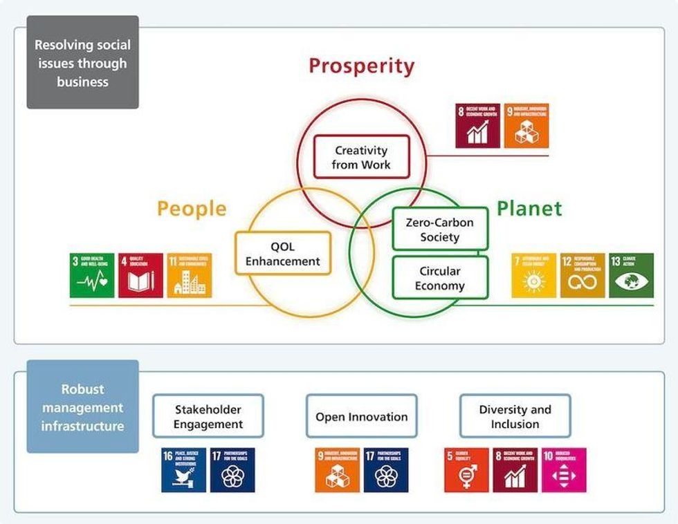 Para a Ricoh, uma sociedade ideal sustentável é aquela em que se mantém o equilíbrio dos "Três Ps": Prosperidade, Pessoas e Planeta. Para conseguir isto, identificou sete questões materiais em duas áreas, "tratando de questões sociais por meio dos negócios" e " infraestrutura de gestão robusta". Além disso, a Ricoh estabeleceu 17 objetivos ESG ligados a cada materialidade, e todos, tanto a gerência quanto os funcionários, estão trabalhando para atingir esses objetivos com muita conscientização.